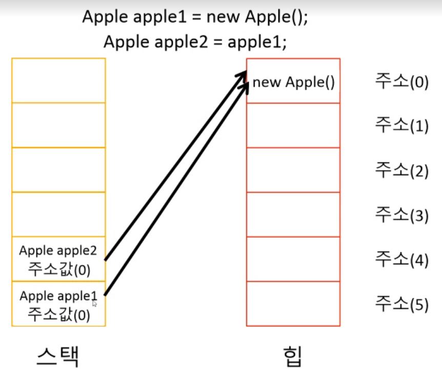 Apple apple2 = apple1; // apple2는 apple1의 메모리주소를 복사